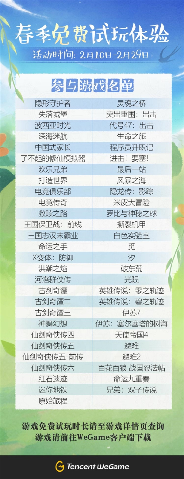 腾讯WeGame游戏平台官微宣布,WeGame平台55款单机游戏开启限时免费试玩,活动截至2月29日结束。换言之在2月份剩下的大半个月里,国内PC玩家可以免费畅玩WeGame单机游戏。