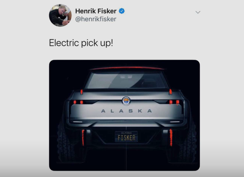 据外媒报道,电动汽车初创企业Fisker首席执行官Henrik Fisker周三在其个人推特帐户上意外发布了一张可能是该公司全新电动皮卡的照片,并附有简短标题:“电动皮卡!”。目前该推文已被删除。Fisker告诉Roadshow,该消息是“无意发布的,已被迅速删除”。Motor1获取了可能的电动皮卡的截图,图像显示它的名字叫阿拉斯加(Alaska)。