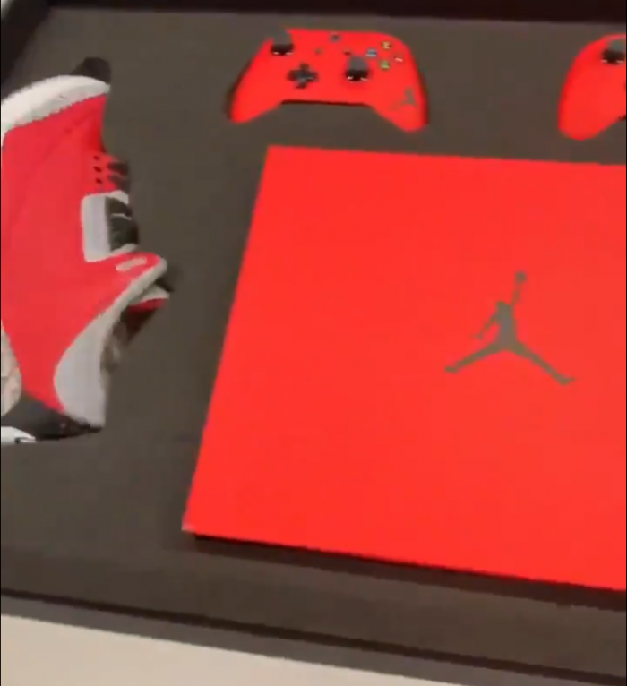 不出粉丝们预料,此次Xbox与AJ的联名合作商品为Xbox One+球鞋+手柄的套装。从视频中我们能够看到印有辨识度极高的AJ大Logo的主机以及两只手柄,均为纯粹的大红配色,符合昨日官方的暗示。