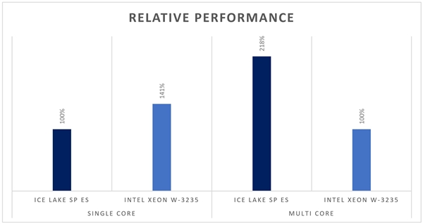 在这样频率低了将近四成的极不公平对比下,Ice Lake新品的单核心性能比Cascade Lake低了足有29%(等效于后者高41%),但是多核心性能竟然领先118%,翻了一倍还多!