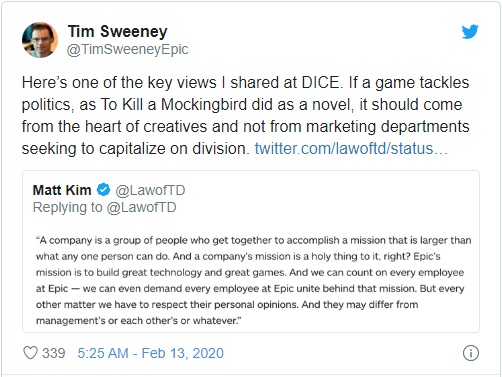 会后,Sweeney 在 Twitter 上进一步阐明了自己的观点。即他并非呼吁游戏应该完全避开政治,因为此类游戏应该从创造性的角度去考虑、而非出于营销的目的。