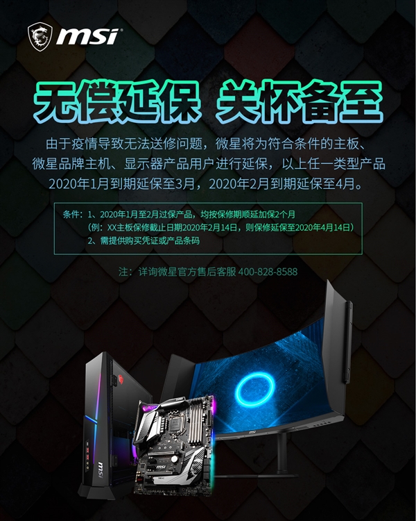 由于疫情导致无法送修问题,微星将为符合条件的主板、微星品牌主机、显示器产品用户进行延保,以上任一类型产品2020年1月到期延保至3月,2020年2月到期延保至4月。
