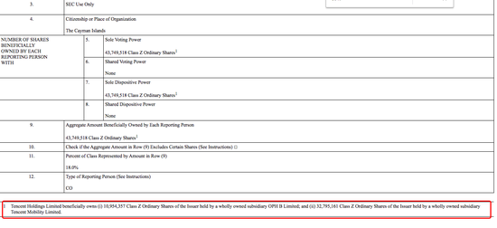 文件显示,腾讯控股通过全资子公司腾讯移动(Tencent Mobility Limited.)持有哔哩哔哩32,795,161股Z类普通股,持股比例达到13.5%;并通过另一家全资子公司OPH B Limited持有10,954,357股Z类普通股,持股比例达到4.5%。