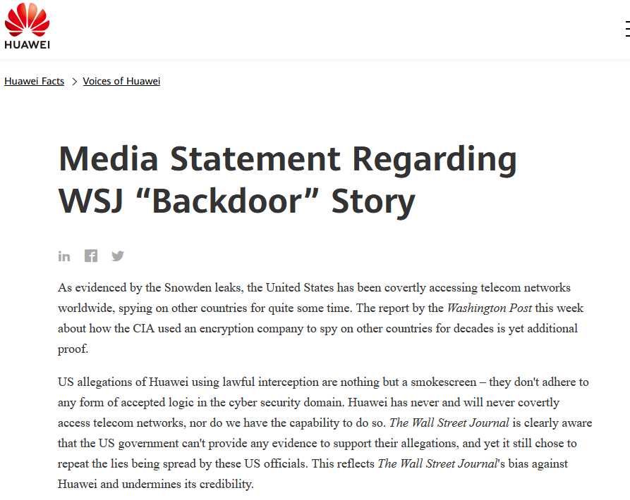 华为声明指出,美国指责的情况是不可能存在的,“华为只是一家设备厂商,在没有获得客户授权的情况下,访问它们的网络是不可能的。我们不具备绕开运营商、访问控制系统,在不被正常运行的防火墙或安全系统发现的情况下从网络中获取数据的能力。事实上,甚至《华尔街日报》也承认,美国官员无法提供与所谓‘后门’有关的具体证据”。