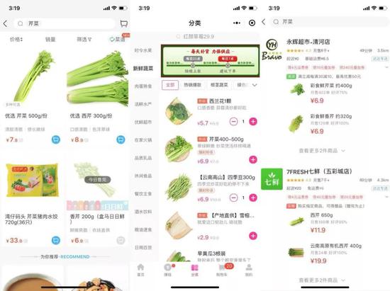 (依次为盒马鲜生、每日优鲜、京东到家价格)