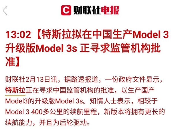 近日,有媒体报道,特斯拉正在寻求中国监管机构的批准,以生产国产Model3的升级版Model 3s。同时有知情人士表示,相较于Model 3 400多公里的续航里程,Model 3s将拥有更长的续航能力,并且为后轮驱动。
