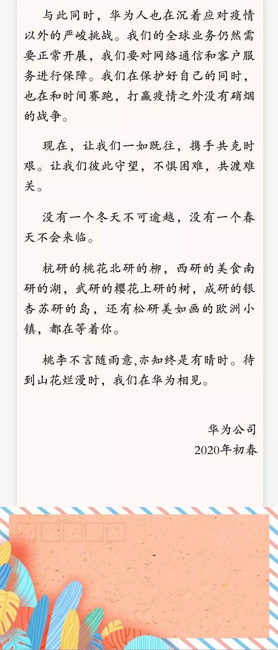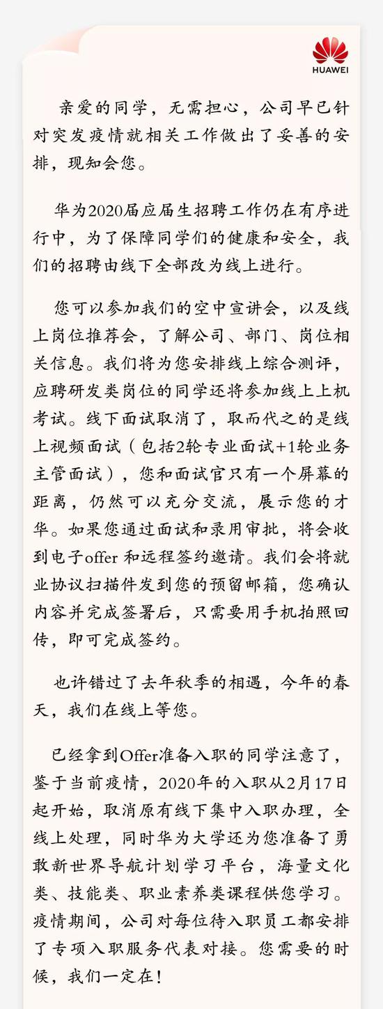 2月13日晚间消息,华为在心声社区发布写给应届毕业生的一封封,说明由于疫情影响,华为的招聘将由线下改为线上,但并不会因为疫情而影响人才招聘。以下为华为心声社区全文:
