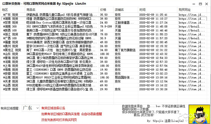 数据主要来源于淘宝、天猫、京东,像有品、网易严选这样的网站并未纳入监控。软件每隔5秒钟会自动刷新一次,只要有口罩上架,就会自动出现在列表中。结果列表支持点击,可以一键直达商品页面,操作起来还是很方便的。目前身边已经有小伙伴用它抢到了口罩,有需要的朋友不妨也来试一试。