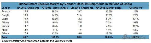 智能音箱市场整体增长44.7%,总出货量为5570万台,高于2018年第四季度的3850万台。 Strategy Analytics表示,尽管冠状病毒导致供应链暂时停工,但预计2020年将是智能音箱销售出货量创纪录的一年。