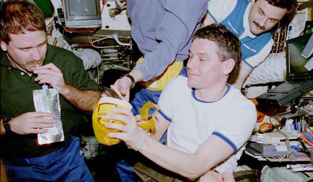 2、这是和平号空间站的用餐时间,在这张1997年的照片中,美国宇航员杰夫•格伦斯菲尔德(左)正在喝饮料,而宇航员瓦莱丽•科尔森、亚历山大•卡雷利在一旁看着。