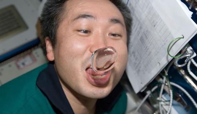 3、日本宇航员若田光一(Koichi Wakata)在国际空间站演示如何喝水的方法,而不是喝酒。