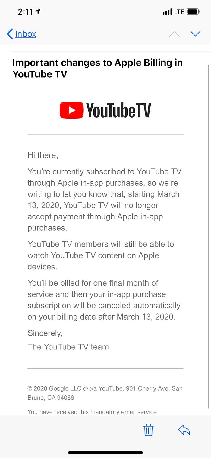 继之前宣布在iPhone和iPad上不再接受内购订阅方式来注册YouTube TV之后,今天YouTube决定要从苹果用户订阅中获得更高的分成收入。谷歌已经向YouTube TV用户发送电子邮件,表示将会在今年3月开始完全淘汰应用内付款的支持。之后所有苹果设备用户必须要通过网络浏览器来订阅YouTube TV。