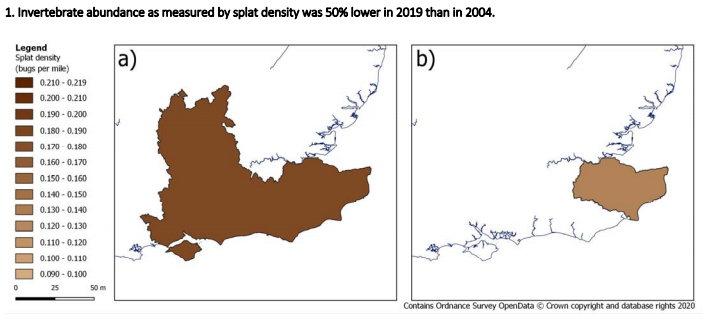 丹麦的另一项调查研究了1997年至2017年每个夏季收集的数据,发现昆虫丰度下降了80%。这项研究使用的数据来自在每年夏季在同一条道路上平均有65次相同速度的汽车行驶测试。