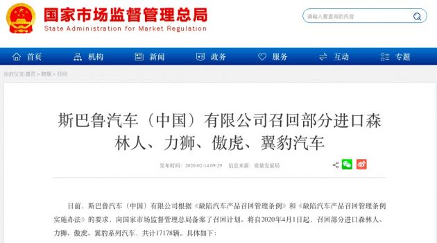 2月14日,国家市场监督管理总局网站发布信息,斯巴鲁汽车(中国)有限公司将自2020年4月1日起,召回部分进口森林人、力狮、傲虎、翼豹系列汽车,共计17178辆。据介绍,本次召回范围内部分车辆的副驾驶席前安全气囊装配了高田公司生产的未带干燥剂的硝酸铵气体发生器。