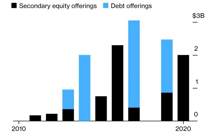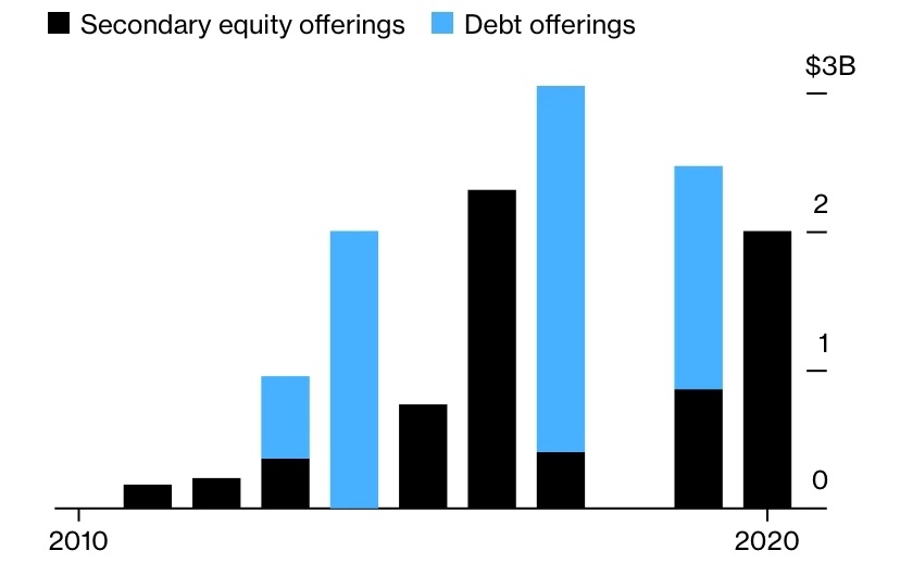 图示:2010年以来特斯拉融资规模。黑色为发行普通股,蓝色为发行债券(单位:10亿美元)。