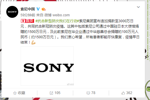 抗击肺炎疫情 索尼追加捐款至3000万日元