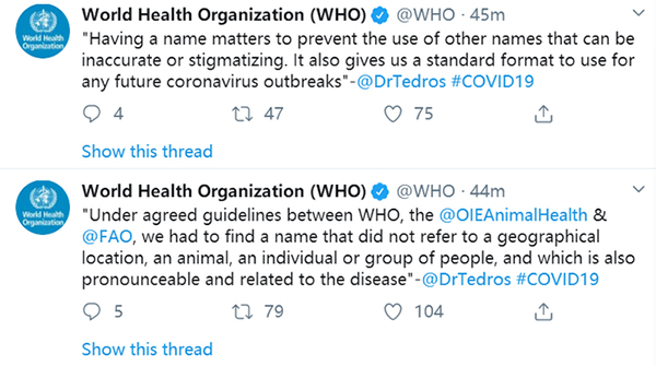 一位听了世界卫生组织总干事谭德塞新闻发布会的记者在推特上发文称,“病毒终于有了一个名字,COVID-19”,他在不久后将这个错误的表述改正。