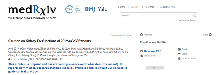 2 月 12 日,由第三军医大学研究团队领衔的名为《2019 年新型冠状肺炎患者肾功能不全的注意事项》(Caution on Kidney Dysfunctions of 2019-nCoV Patients)的论文在预印本网站 medRxiv 上发表。