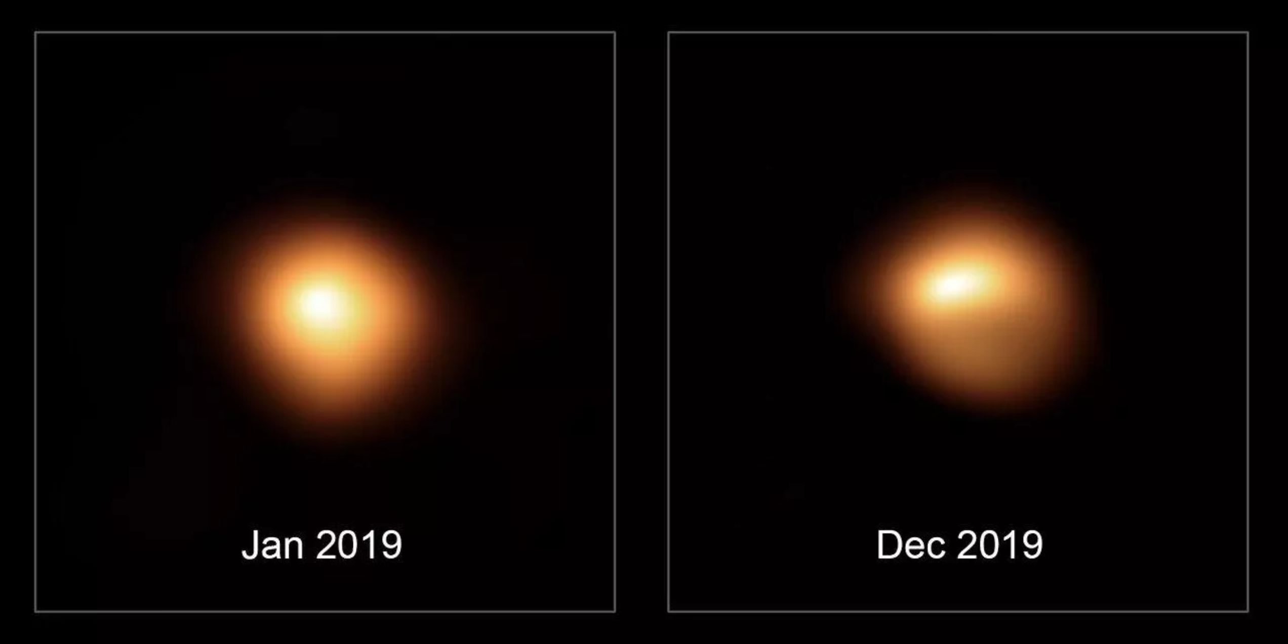 深大望远镜的Sphere仪器在2019年12月捕捉到了它的表面图像,当时这颗恒星正在失去它的亮度。为此,天文学家们将这张图像跟在2019年1月拍摄到的图像进行了对比,不难看出,参宿四正面临着亮度危机。