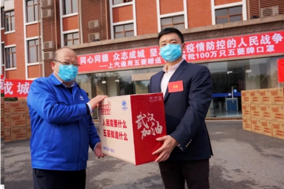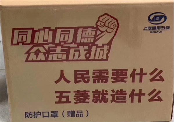 目前,已生产下线的前100万只“五菱牌口罩”在现场已正式交付。在上汽通用五菱生产的医用口罩包装上,印有“人民需要什么 五菱就造什么”。