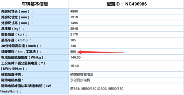 双电机车型搭载的是最大功率222马力前驱动电机和272马力的后驱动电机,整备质量2170kg,NEDC综合续航550km。