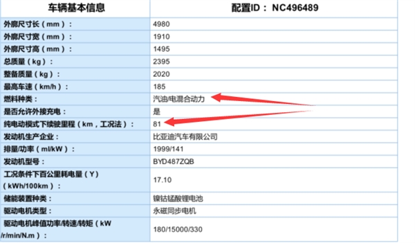 此外,汉DM车型发动机最大功率192马力,电机最大功率245马力,整备质量2020kg,配备三元锂电池,NEDC纯电综合续航里程为81km。