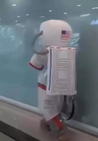 在深圳宝安机场一名乘客,为防疫穿上了“航天服”
