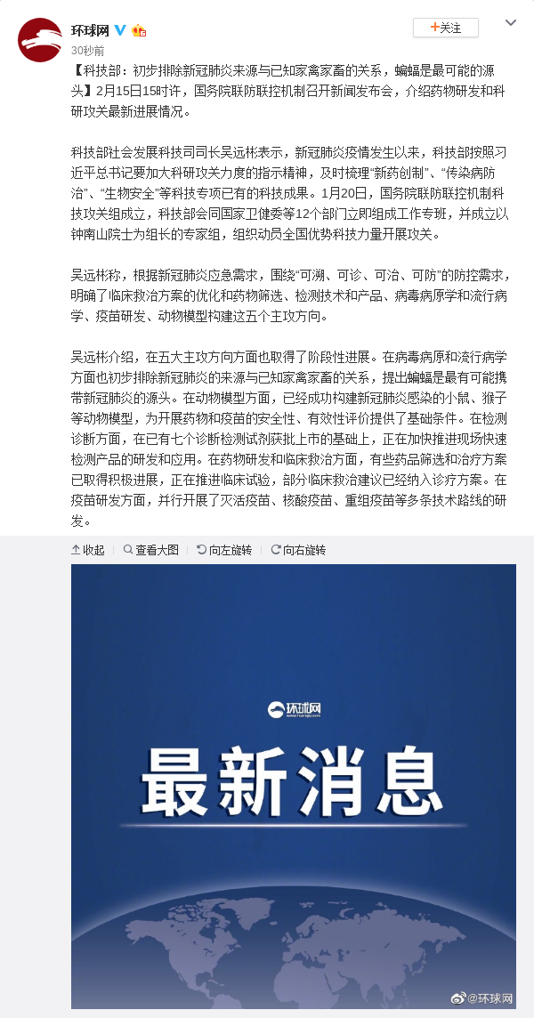 吴远彬介绍,在五大主攻方向方面也取得了阶段性进展。在病毒病原和流行病学方面也初步排除新冠肺炎的来源与已知家禽家畜的关系,提出蝙蝠是最有可能携带新冠肺炎的源头。在动物模型方面,已经成功构建新冠肺炎感染的小鼠、猴子等动物模型,为开展药物和疫苗的安全性、有效性评价提供了基础条件。