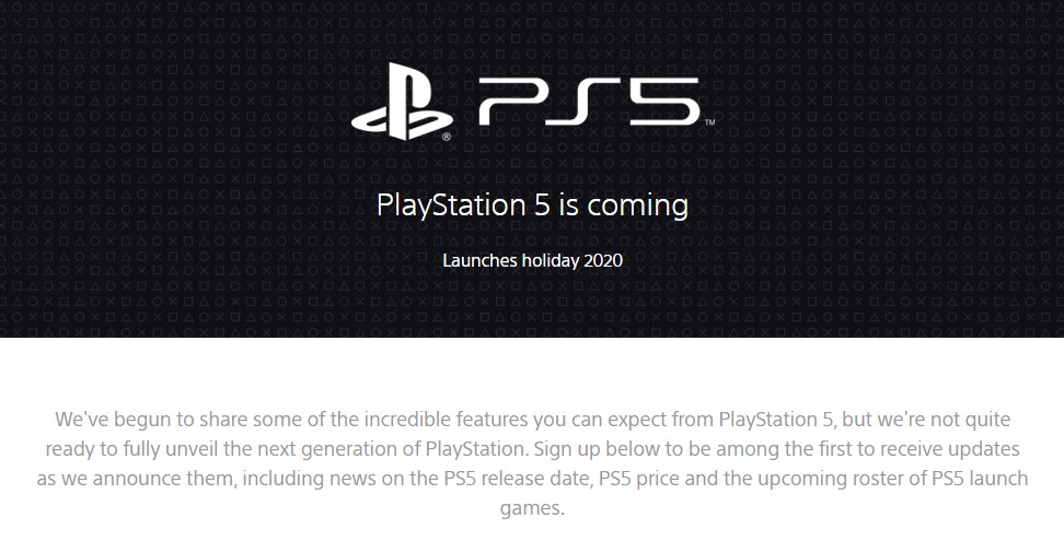 PlayStation 官方在介绍中说道:“我们已经开始分享一些你能够在 PlayStation 5 里发现的令人难以置信的功能,但我们还没有完全准备好发布下一代的 PlayStation。当我们发布最新消息时,在下方注册的用户将会最先收到更新,包括 PS5 的发布日期、PS5 价格以及即将发布的 PS5 游戏阵容。”