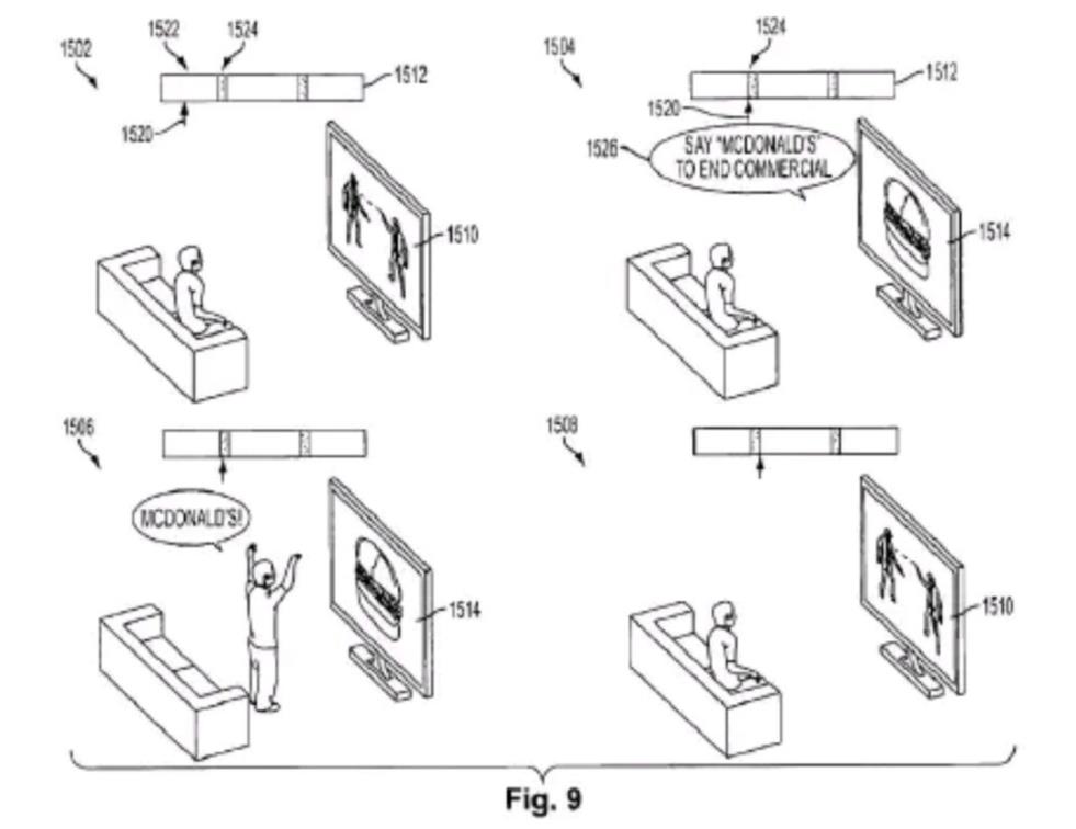正式上图所示,当你在观看喜欢的电视剧时,突出出现了麦当劳汉堡的广告,只要站在客厅大举起双臂大喊“麦当劳“,就像篮球裁判宣布得分有效一样,接着广告就会自动关闭,你可以坐下继续看原来的电视节目。