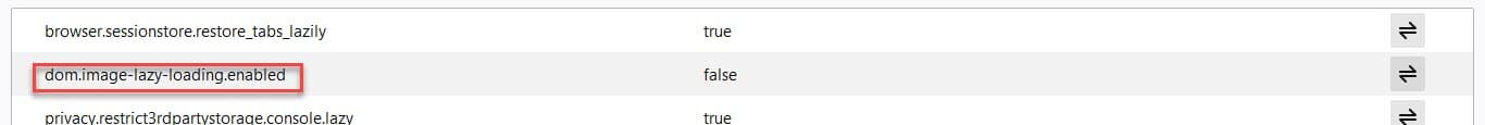 3. 搜索“lazy”,在突出显示的结果中,将 dom.image-lazy-loading.enabled pref 值更改为true