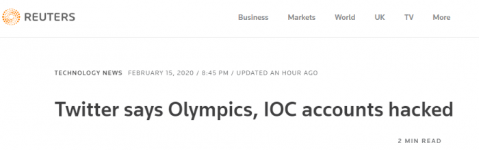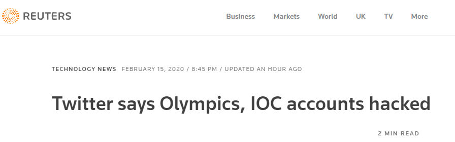 推特公司15日表示,奥运会官方推特账号和国际奥委会(IOC)媒体事务的推特账号被黑客入侵,目前已被暂时锁定。报道称,推特公司的发言人在一封电子邮件声明中说,这些账号是通过第三方平台被黑的。除此之外,这位发言人没有提供黑客入侵更多细节。