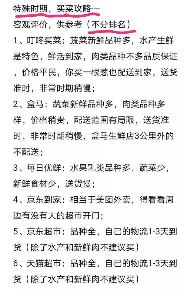 这些有经验的网友为了抢菜甚至还摸清楚了各个买菜 App 的情况,写出了一套各大生鲜平台的点评攻略:
