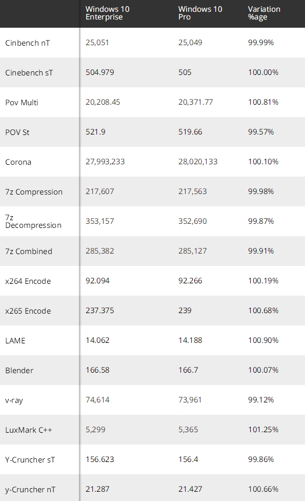 随后,Tom's Hareware也进行了重新测试验证,结果发现无论专业版还是企业版Windows 10,撕裂者3990X的性能是完全一样的,绝大多数项目的差异不到0.3%,都在误差范围内,最极端的也不过1.25%,不足为虑。