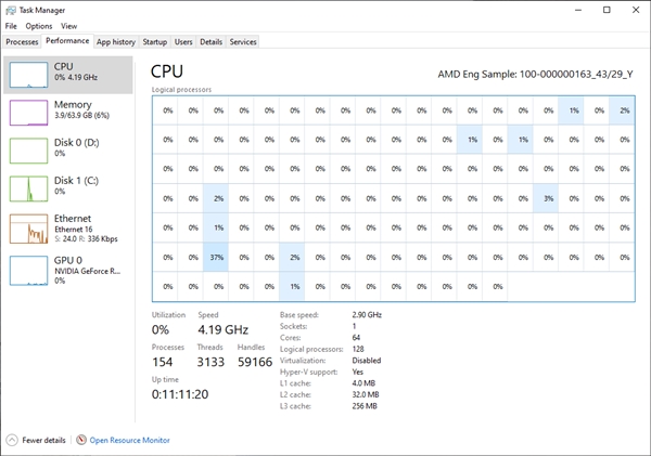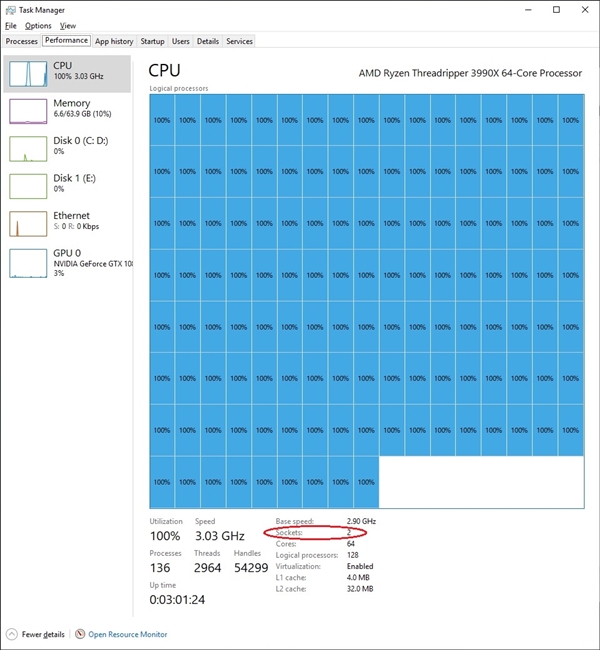 同时,Windows 10无论专业版还是企业版,都没有把128个线程分成两路,而是完整的一路。
