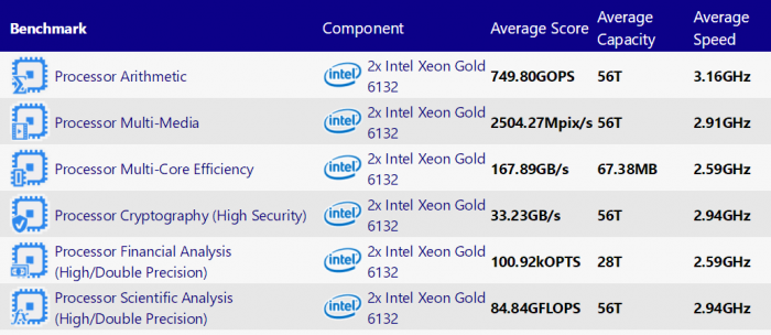测试结果显示,这颗新的14核心28线程算术性能360.36GOPS,多媒体性能1471.17Mp/s,高精度加密性能23.04GB/s。
