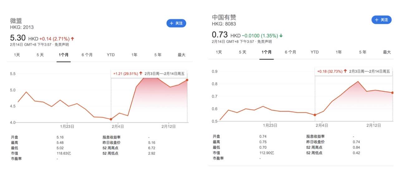 中国有赞、微盟股价表现(2月3日-14日)