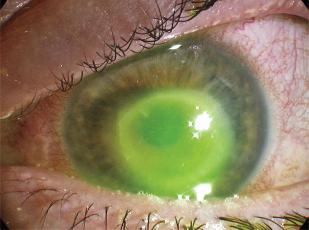 英国一名妇女被诊断为棘阿米巴角膜炎,这是一种罕见的眼部寄生虫感染。上图为该女子受感染的眼睛。绿色部分是一种特殊染料,用于检测角膜的损伤