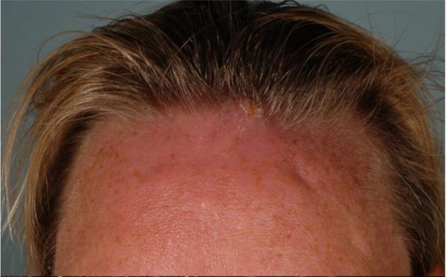 一名英国女性访问乌干达时,前额被一只蝇类幼虫感染了。上图可看到该女士发际线附近的幼虫呼吸口,周围区域已经红肿