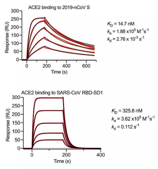 让McLellan和他的同事感到吃惊的是,通过表面等离子共振技术(SPR)分析得到的结果。新型冠状病毒S蛋白与ACE2的平衡解离常数KD是15 nM,而SARS病毒S蛋白与ACE2的平衡解离常数KD竟然达到了325.8 nM。