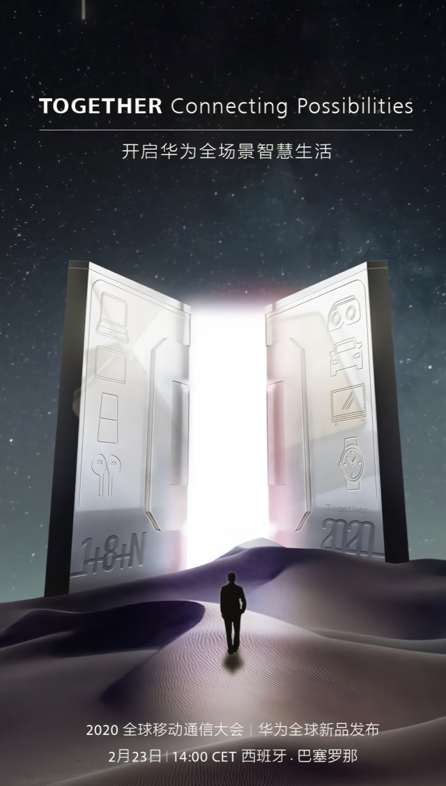 在GSMA宣布取消MWC 2020之前,华为终端曾在其官方微博上公布过此次“5G全场景”系列发布会预热海报,海报显示,华为全球新品发布会定档2月23日,主题是“开启华为全场景智慧生活”,预热图中还出现了一段神秘代码,如1+8+N、5G、通信等。