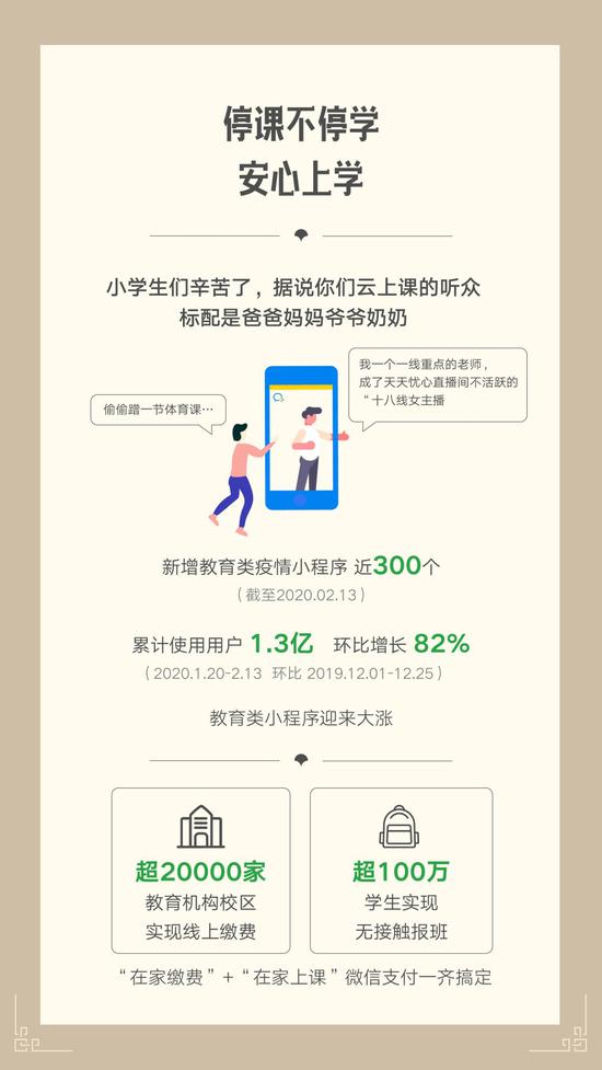 截至2月13日,教育类小程序新增近300个,累计使用用户达1.3亿,环比去年增长82%。同时,超20000家教育机构校区借助微信支付实现了线上缴费,超100万学生实现无接触报班。