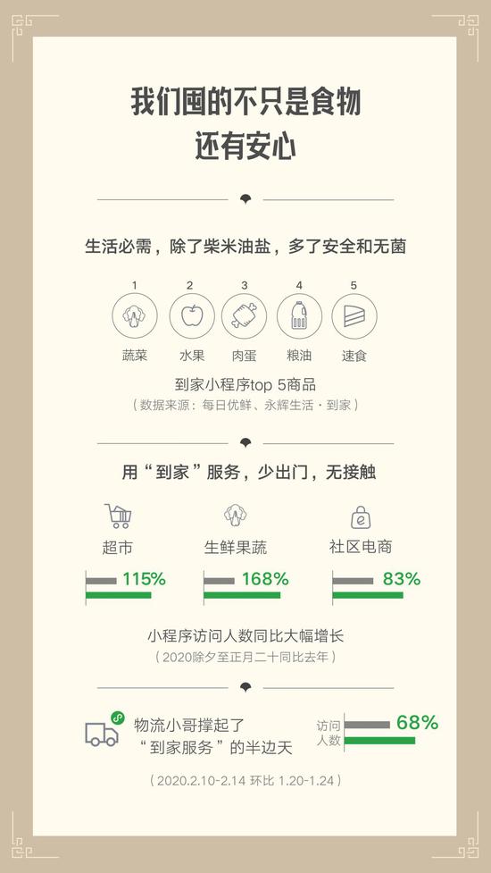 2月17日午间消息,微信发布《微信战“疫”数据报告》,涉及从小程序到家业务、无接触服务、疫情动态、远程办公、在线教育等多方面数据。截至2月14日,小程序超市业态访问量同比增长115%,生鲜果蔬业态访问量同比增长168%,社区电商业态同比增长83%。复工后,物流行业小程序访问量环比上涨68%。