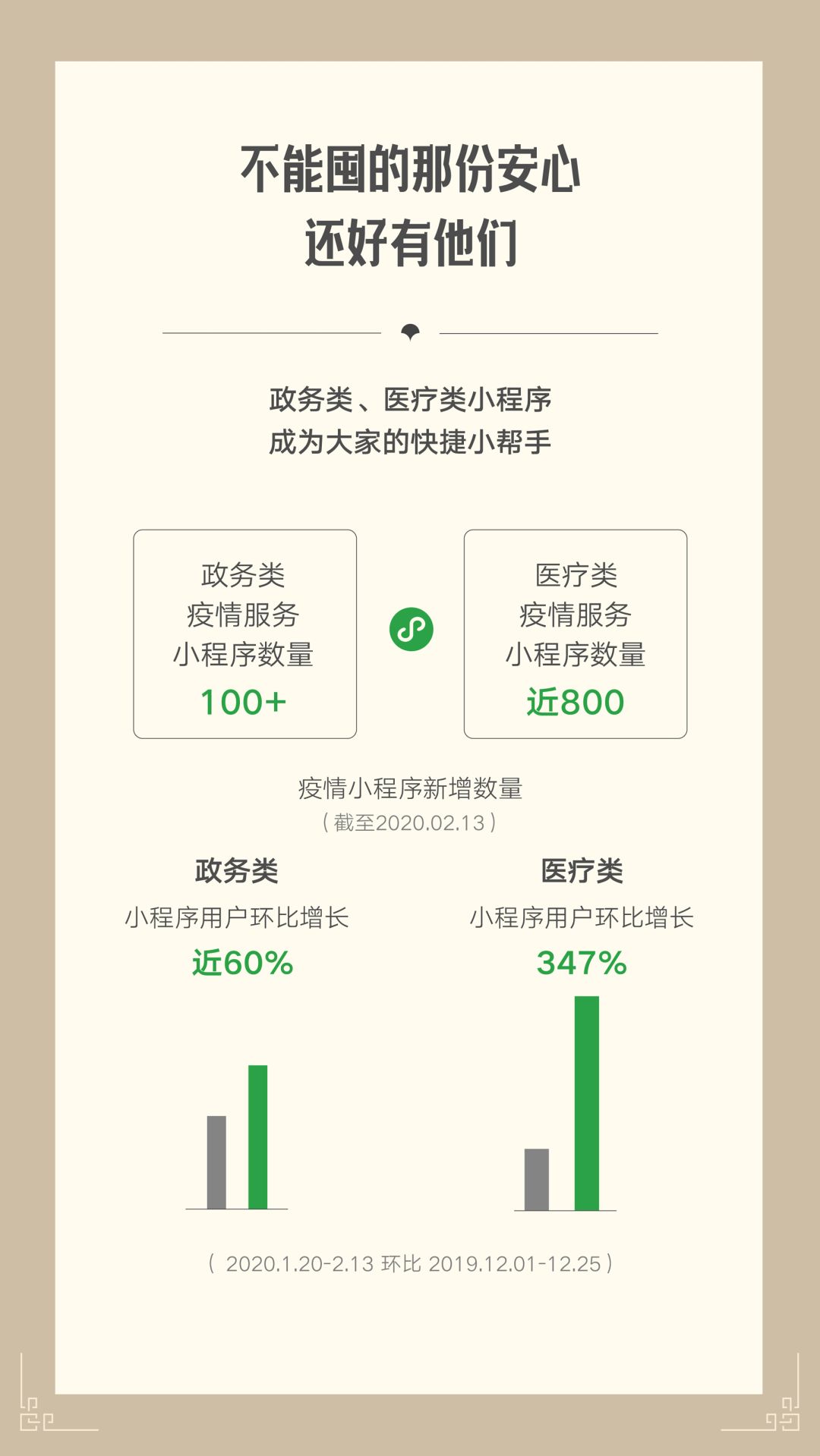 疫情期间,新增100余政务类疫情服务小程序及近800个医疗类疫情服务小程序。环比去年同期,政务类小程序用户增长近60%,医疗类小程序用户增长了347%。
