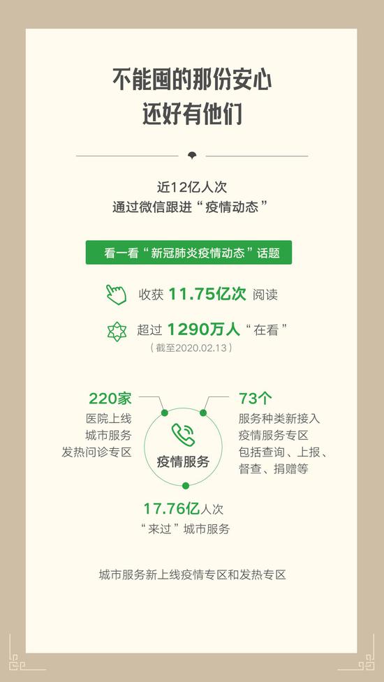微信城市服务开通疫情专区以来访问量剧增,共有17.76亿人次使用过城市服务;超过220家医院上线城市服务发热问诊专区,新接入73个服务种类,包括查询、上报、督查、捐赠等。