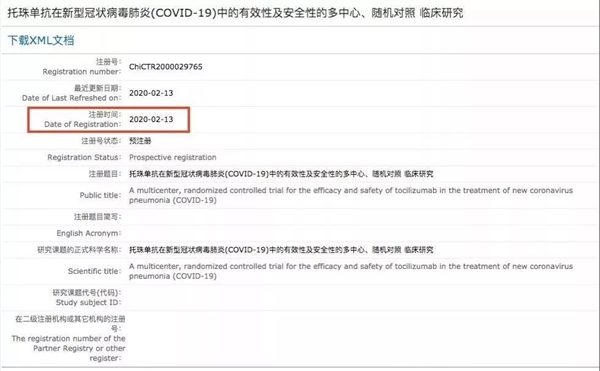 2月13日,据中国临床试验注册中心显示,“托珠单抗在新型冠状病毒肺炎(COVID-19)中的有效性及安全性的多中心、随机对照临床研究”已经通过临床试验注册(注册号:ChiCTR2000029765)。