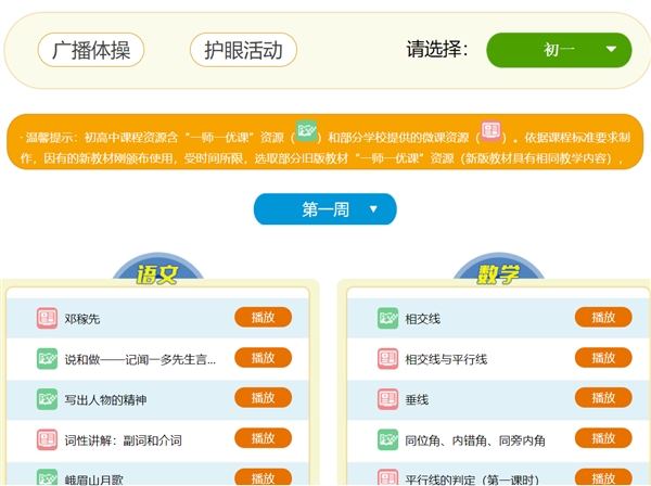 其中课程学习模块,是从近年来全国开发的课程资源中择优选取,并根据需要由北京等地的骨干教师补充录制,课程覆盖了初高中12个学科;课程将分周陆续上线,第一周上线169节。
