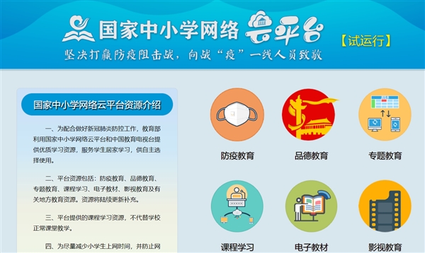 国家中小学网络云平台提供防疫教育、品德教育、专题教育、课程学习、电子教材及影视教育等6大模块的学习资源。