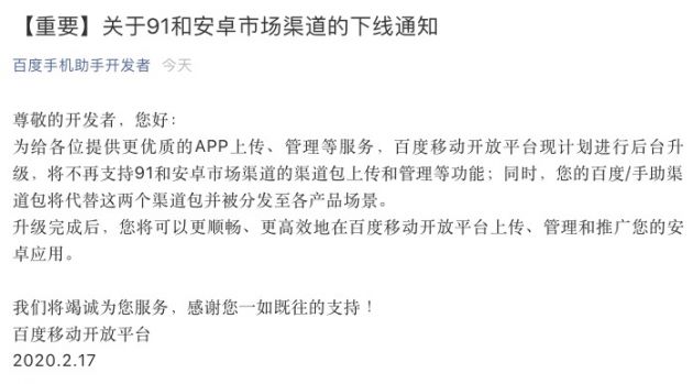 2月17日,百度移动开放平台发布关于91和安卓市场渠道的下线通知,通知称,百度移动开放平台现计划进行后台升级,将不再支持91和安卓市场渠道的渠道包上传和管理等功能。用户的百度/手助渠道包将代替这两个渠道包并被分发至各产品场景。