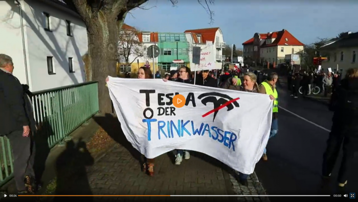 环保组织除了上法院,在当地的游行也没停,从特斯拉建厂开始,每天当地都有示威者上街,说这个工厂对当地的野生动物和水源有挺大影响,举的条幅上面写着:选特斯拉还是选喝水。